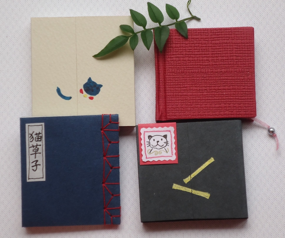 「猫言葉」「小さなしあわせ」は ハードカバー。「お地蔵さま」や 「ちこ犬失敗譚十話」「猫草子」など和綴じ。紙選びも楽しみです。
