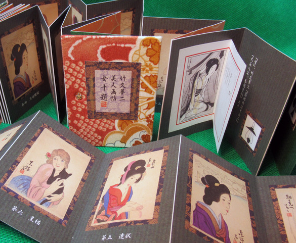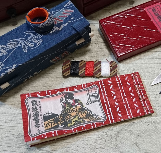 6×8cmの折本に切り絵、押絵、日本刺繡で百年前の旧家や商家、江戸などの情景を描きます。古布使用の一点ものです。