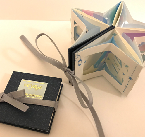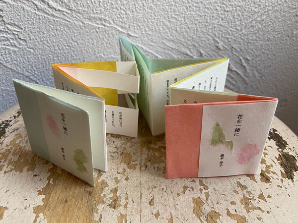 背中合わせ製本や魚の骨折り本など、糸綴じをしない様々な製法でちょっと変わった豆本を作っています。