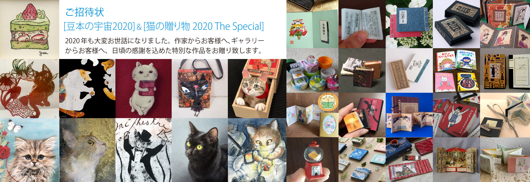 Artist: / / / / / / / / / 「豆本の宇宙2020」:青石書房、五十嵐彪太(瓢箪堂)、岡 文子(風花水舎)、佐藤りえ(文藝豆本ぽっぺん堂)、田中栞、ちぎり屋さゆき、ちむにど、つまびきや、手づくり豆えほんやら「マメカバ本舗」、どーる・HONOKA、花霞幻燈、花まめ書房、版屋寅豆商店 関川敦子、びー玉 上山榮子、ひつじ雲書房、風古堂(ふうこどう)、hokori、豆筥堂(まめはこどう)、MIW@、森本歩子、teshigoto、yu.coto