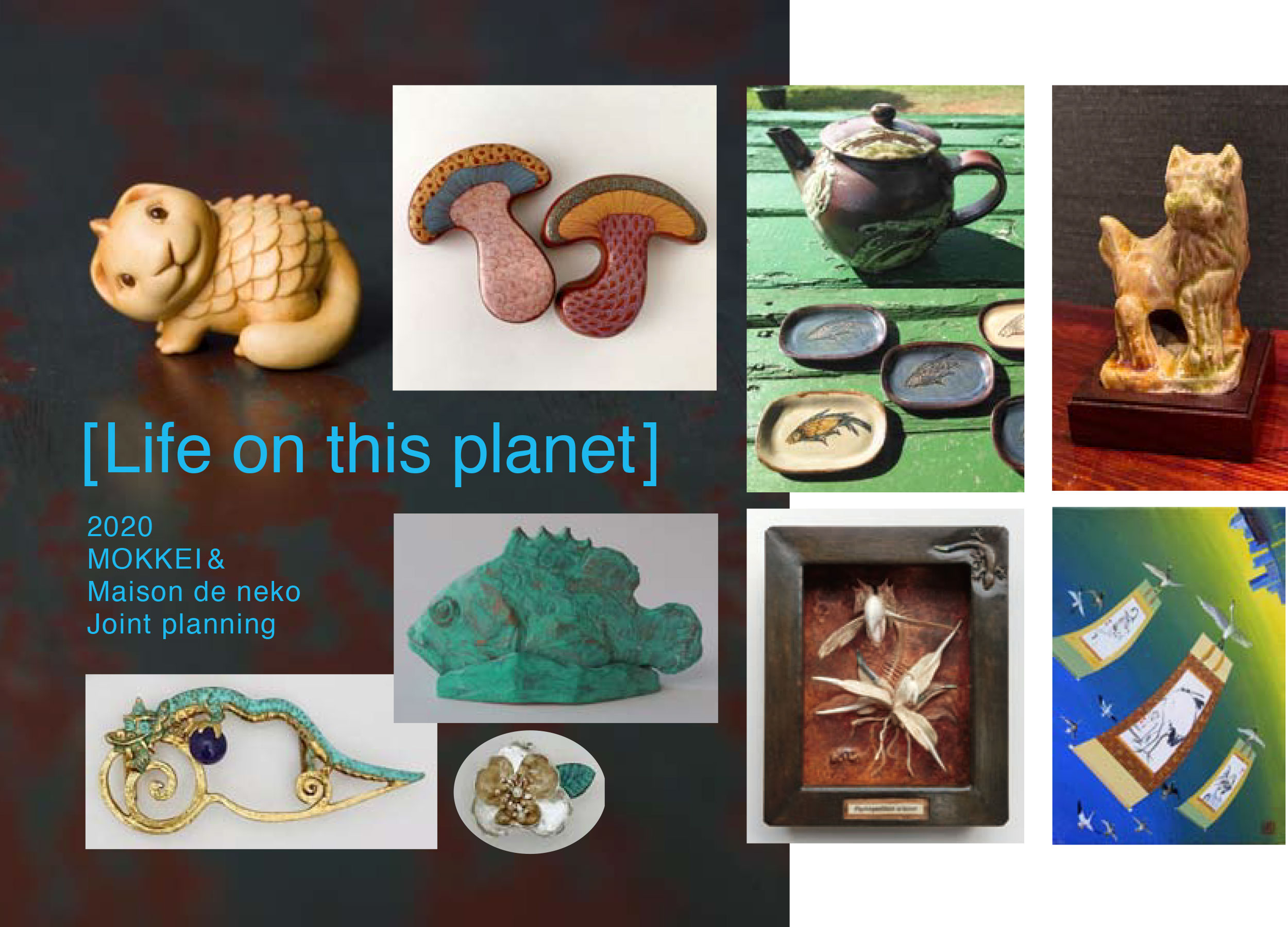 「Life on this planet」は地球上の生き物達をテーマに、古美術「木雞」とギャラリー「メゾンドネコ」の2店舗による共同企画展です。展示内容は、東洋とオランダのやきものを中心とした古美術の世界と、現代の木彫、陶器、彫金、絵画などの作家たちとの競演です。