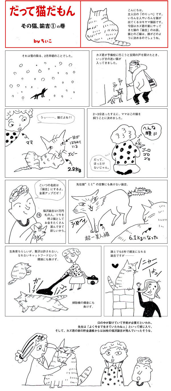 Owner's Room こんにちは、ちぃこです。前世は猫だったと思うほど猫と通じる私です。そんな私の不思議話や面白話をマンガで提供いたします。猫と暮らした事のあるかたは、猫たちの表情に思い当たる節があるのでは…。 第6話 その猫、諭吉①の巻